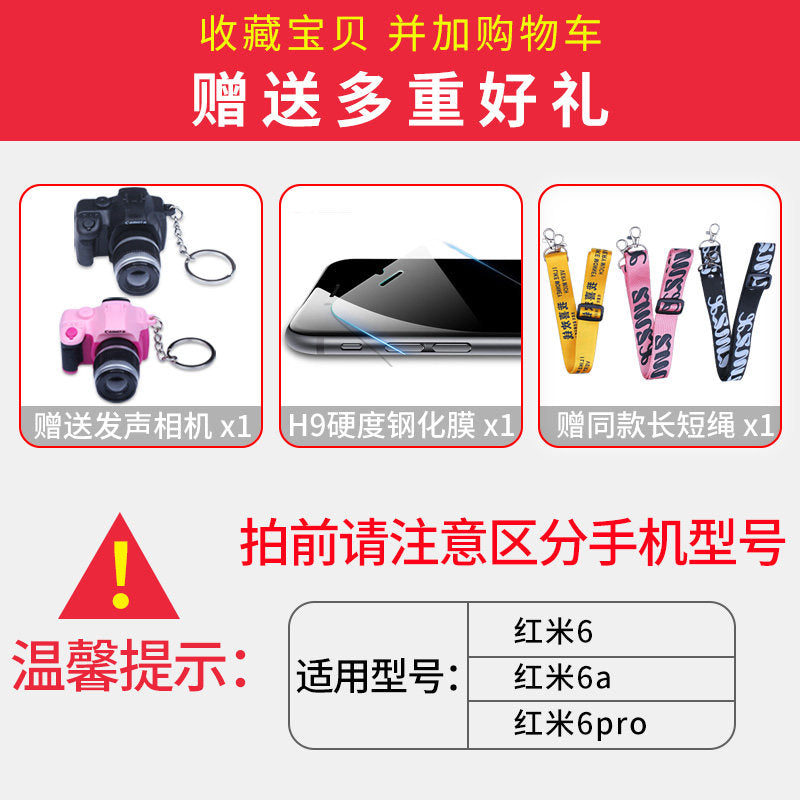颜色分类: 收藏加购宝贝就送豪华大礼包---请选择对应手机型号拍下---此项勿拍 红米6a[粉色相机腕带+粉色相机+斜挂绳+钢化膜] 红米6a[黑色相机腕带+黑色相机+斜挂绳+钢化膜] 红米6a[黄色相机腕带+黑色相机+斜挂绳+钢化膜] 红米6[粉色相机腕带+粉色相机+斜挂绳+钢化膜] 红米6[黑色相机腕带+黑色相机+斜挂绳+钢化膜] 红米6[黄色相机腕带+黑色相机+斜挂绳+钢化膜] 红米6pro[粉色相机腕带+粉色相机+斜挂绳+钢化膜] 红米6pro[黑色相机腕带+黑色相机+斜挂绳+钢化膜] 红米6pro[黄色相机腕带+黑色相机+斜挂绳+钢化膜]