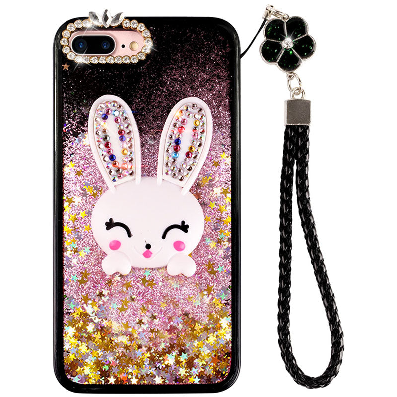 苹果iPhone5s 6s 7奢华水钻兔子支架xr液体流动流沙闪粉亮片8plus女xsmax手机壳SE潮牌oppo15挂绳vivox23 x27