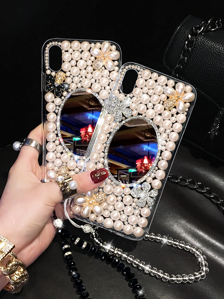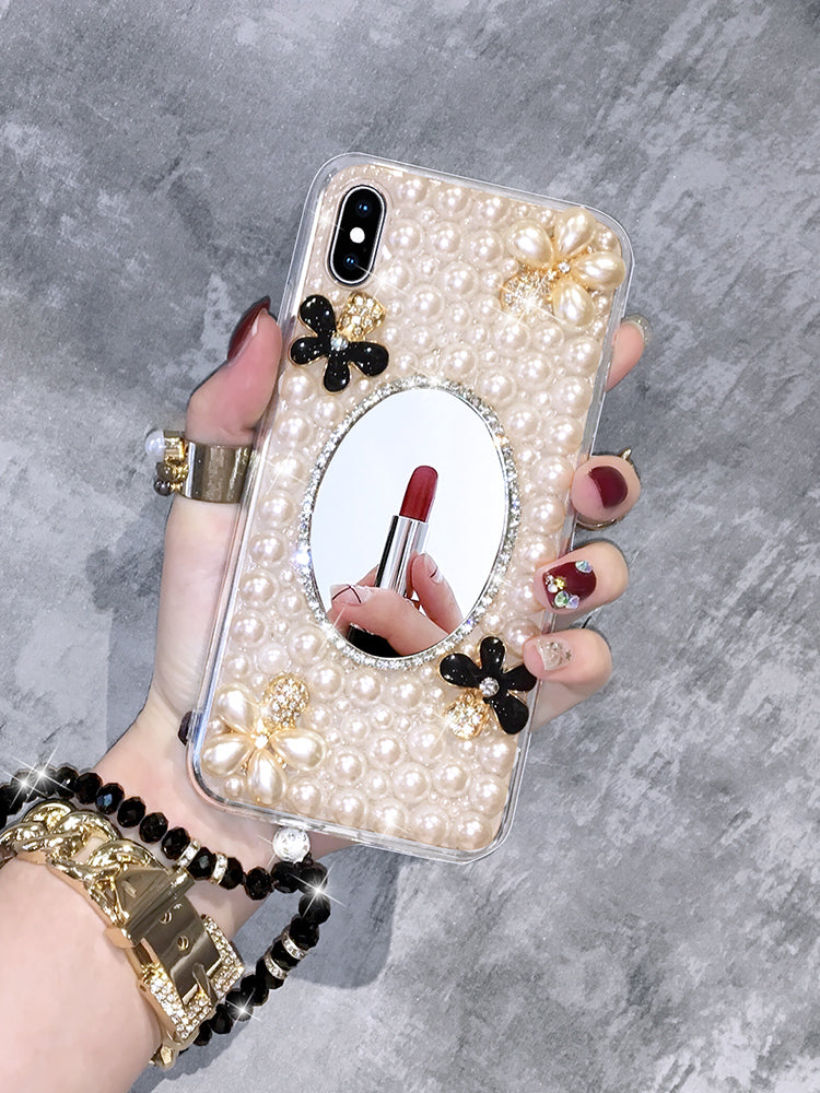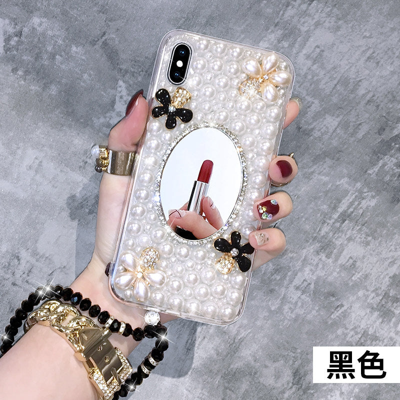 苹果X手机壳xsmax珍珠8plus补妆镜子iphonexr硅胶6s水钻6splus全包透明边iPhone7花朵8x镜面7p水晶手绳8潮女